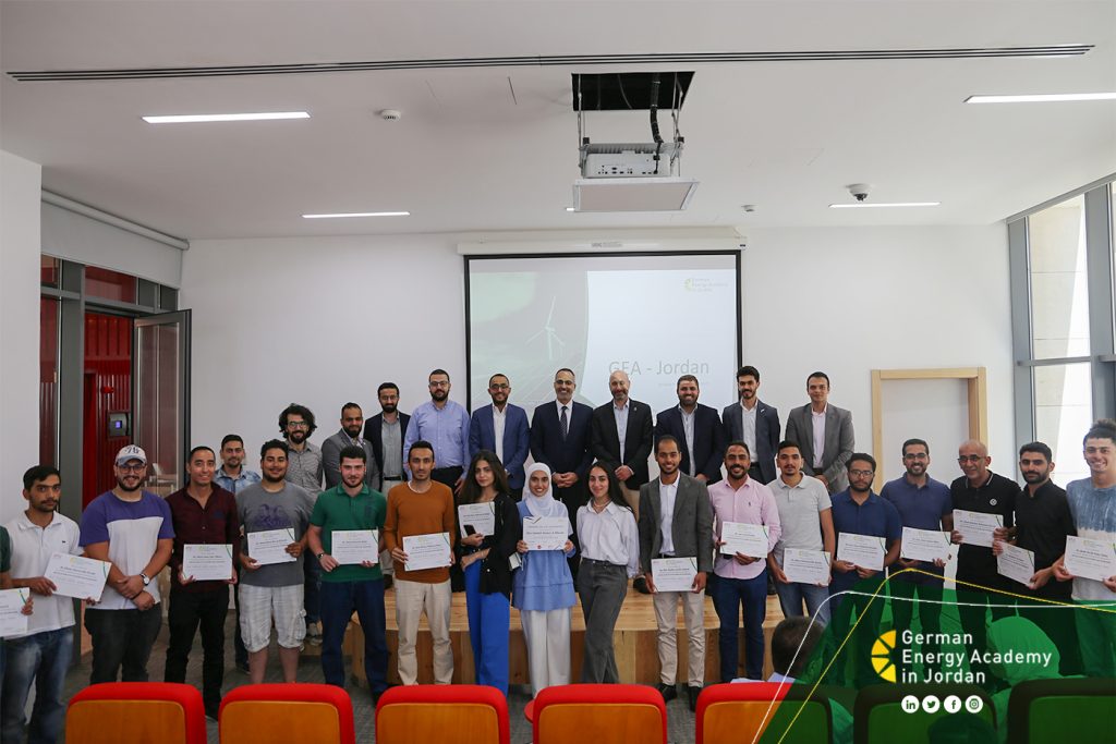 اختتمت أكاديمية الطاقة الألمانية في الأردن يوم الخميس الموافق لـ 11 أغسطس (آب) أولى دوراتها المتوسطة في مجال تركيب الأنظمة الشمسية الكهرضوئية وتشغيلها وصيانتها المخصصة للفنيين؛ حيث شارك في الدورة 21 متدرباً ومتدربة من قطاعات مختلفة، منهم 4 متدربين حضروا من فلسطين.