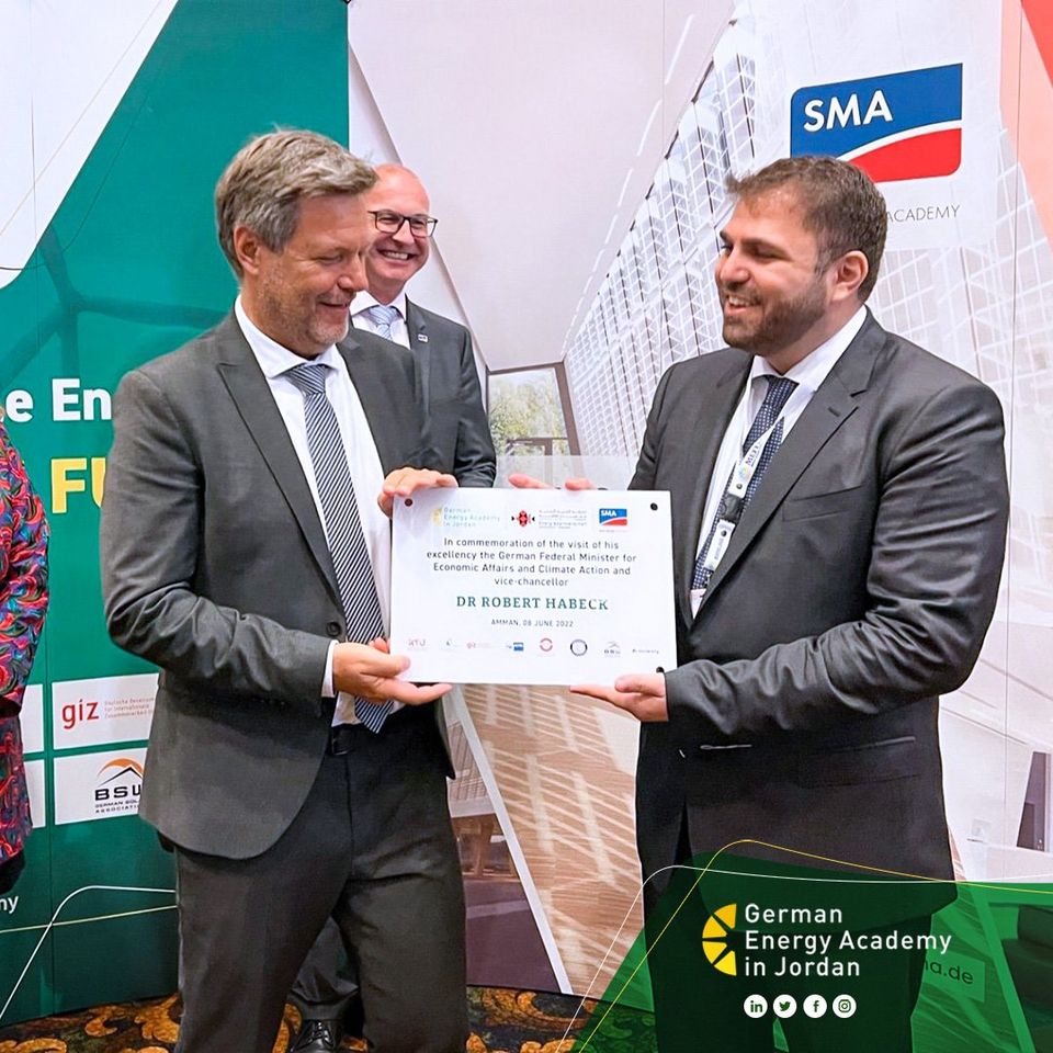 وخلال حفل الإطلاق التقى نائب المستشار الألماني ووزير الطاقة والتغير المناخي بكادر أكاديمية الطاقة الألمانية في الأردن GEA-Jordan، بحضور جميع ممثلي المؤسسات التعليمية والمهنية المشاركة في تأسيس الأكاديمية.